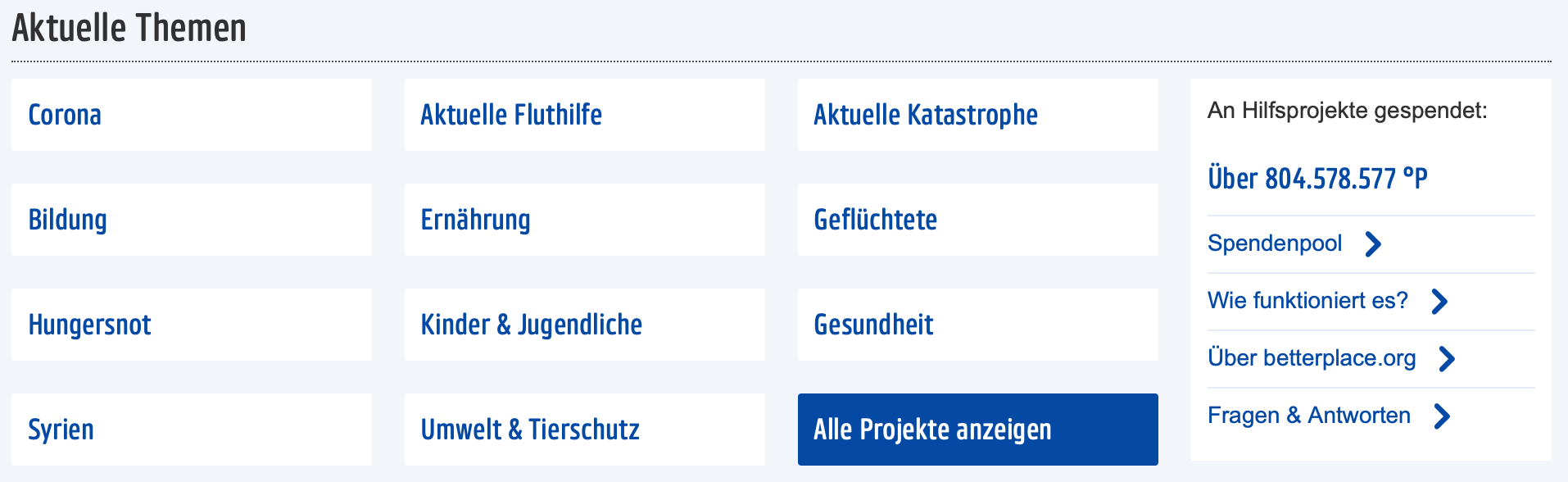 Payback 포인트는 DKMS 뿐만 아니라 매우 폭넓고 다양한 어려움에 처한 다양한 사람들과 단체들에게 기부가 가능했다. 이미 Payback 회원이라면 https://www.payback.de/spendenwelt 에 로그인하여 언제든 바로 기부가 가능하며 아직 회원이 아니라면 Payback 가입한 다음 장 보거나 쇼핑할 때 Payback 포인트롤 모은 후 기부하면 될 것 같다.